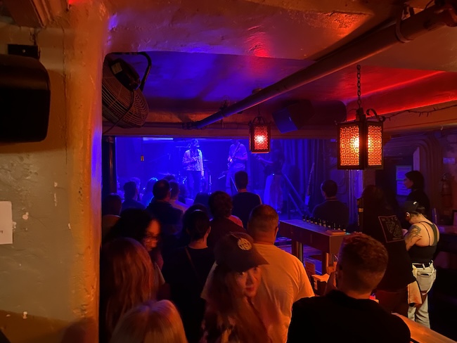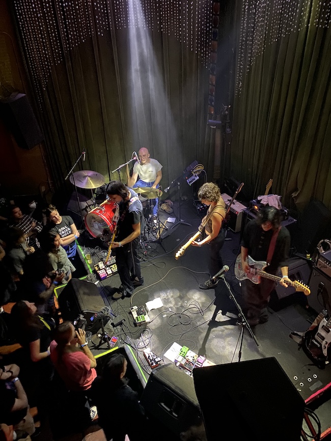 Ready to accept whatever style of music this intriguing group had to offer, I found myself pulled into their vibe right off the bat. Theirs is an arty and morose post-grunge style, and alongside their stern on-stage presentation, I’m guessing that they’re fans of the Julia’s War label and its roster’s opaque, left-field interpretations of today’s prevailing shoegaze / dream-pop trends. Their opening tune bore the subdued threat of violence I hear in Her New Knife; both groups seem to reinterpret Sonic Youth’s moody discordance with an added blackened sense of doom. I would’ve been content with variations on that basic template, but Chemical clearly had a number of musical ideas at work, the guitarist chopping it up Gang Of Four style, shimmering like Billy Corgan in a silver tuxedo and meekly picking at chorus-washed strings like some petrified ’90s goth, sometimes all in the same song, his feet (white athletic socks with velcro Teva sandals) tapping at a finicky chain of pedals. He brought three guitars on stage and admirably used them all in their brief opening set. For as much as I admired his style, the drummer was noticeably cool too, tall and Ramones-y and hunched over in dark sunglasses, though the bassist (also in dark sunglasses) may have been my favorite of the three, confidently delivering her own unusual bass-lines that didn’t replicate the guitar’s melodies so much as dance around them. There was one song in particular where her bass-line was so busy that it seemed to loop beyond the 4/4 timing of the song; I hope to hear it again on their debut EP. They had CDs for sale ahead of the official Bandcamp release date, which in true Y2K-throwback fashion were packaged in clear jewel cases with the name stamped on the CD, ready to be tossed on the passenger-side floor of your boyfriend’s Honda Civic next to back issues of Transworld SKATEboarding and the remnants of last night’s Taco Bell. I’m gonna go pull up the Bandcamp now!